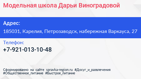 Модельная школа Дарьи Виноградовой по адресу 185031, Карелия, Петрозаводск, набережная Варкауса, 27 в дальнейшем Организация, размещена в следующих категориях: