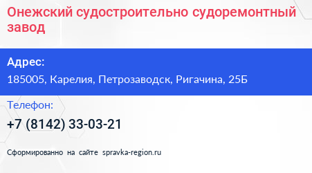 Онежский судостроительно-судоремонтный завод по адресу 185005, Карелия, Петрозаводск, Ригачина, 25Б в дальнейшем Организация, размещена в следующих категориях: