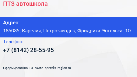 ПТЗ, автошкола по адресу 185035, Карелия, Петрозаводск, Фридриха Энгельса, 10 в дальнейшем Организация, размещена в следующих категориях: