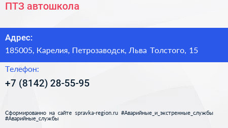 ПТЗ, автошкола по адресу 185005, Карелия, Петрозаводск, Льва Толстого, 15 в дальнейшем Организация, размещена в следующих категориях: