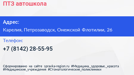 ПТЗ, автошкола по адресу Карелия, Петрозаводск, Онежской Флотилии, 26 в дальнейшем Организация, размещена в следующих категориях: