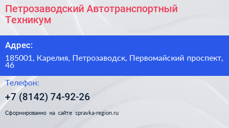 Петрозаводский Автотранспортный Техникум по адресу 185001, Карелия, Петрозаводск, Первомайский проспект, 46 в дальнейшем Организация, размещена в следующих категориях: