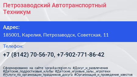 Петрозаводский Автотранспортный Техникум по адресу 185001, Карелия, Петрозаводск, Советская, 11 в дальнейшем Организация, размещена в следующих категориях: