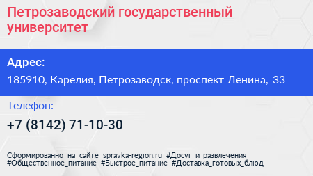Петрозаводский государственный университет по адресу 185910, Карелия, Петрозаводск, проспект Ленина, 33 в дальнейшем Организация, размещена в следующих категориях: