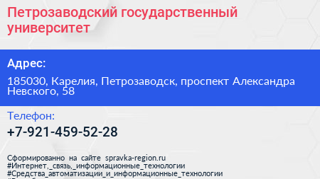 Петрозаводский государственный университет по адресу 185030, Карелия, Петрозаводск, проспект Александра Невского, 58 в дальнейшем Организация, размещена в следующих категориях: