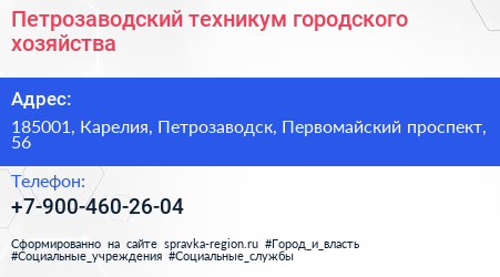 Петрозаводский техникум городского хозяйства по адресу 185001, Карелия, Петрозаводск, Первомайский проспект, 56 в дальнейшем Организация, размещена в следующих категориях: