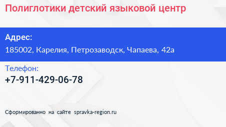 Полиглотики, детский языковой центр по адресу 185002, Карелия, Петрозаводск, Чапаева, 42а в дальнейшем Организация, размещена в следующих категориях: