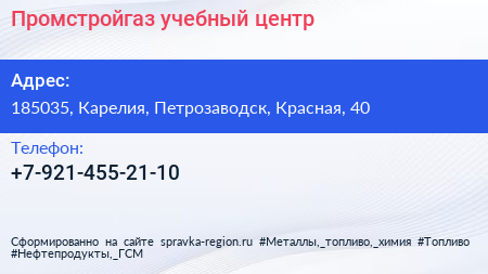 Промстройгаз, учебный центр по адресу 185035, Карелия, Петрозаводск, Красная, 40 в дальнейшем Организация, размещена в следующих категориях: