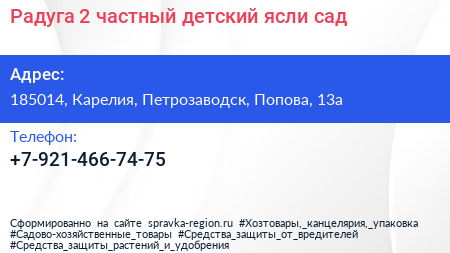 Радуга 2, частный детский ясли-сад по адресу 185014, Карелия, Петрозаводск, Попова, 13а в дальнейшем Организация, размещена в следующих категориях: