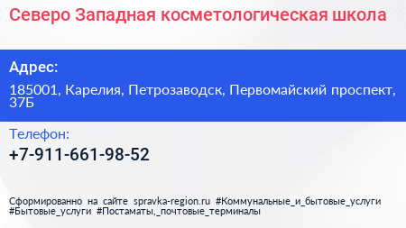 Северо-Западная косметологическая школа по адресу 185001, Карелия, Петрозаводск, Первомайский проспект, 37Б в дальнейшем Организация, размещена в следующих категориях: