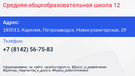 Средняя общеобразовательная школа №12 по адресу 185013, Карелия, Петрозаводск, Новосулажгорская, 29 в дальнейшем Организация, размещена в следующих категориях: