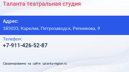 Таланта, театральная студия по адресу 185033, Карелия, Петрозаводск, Репникова, 9 в дальнейшем Организация, размещена в следующих категориях: