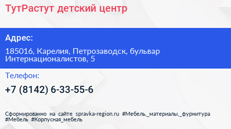 ТутРастут, детский центр по адресу 185016, Карелия, Петрозаводск, бульвар Интернационалистов, 5 в дальнейшем Организация, размещена в следующих категориях: