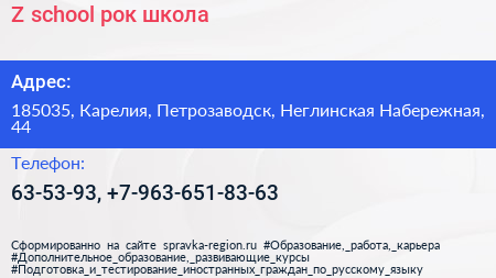 Z-school, рок-школа по адресу 185035, Карелия, Петрозаводск, Неглинская Набережная, 44 в дальнейшем Организация, размещена в следующих категориях: