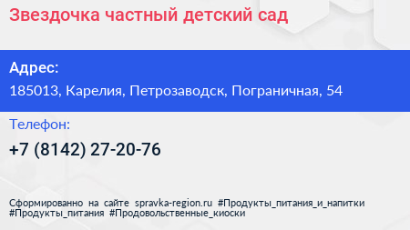 Звездочка, частный детский сад по адресу 185013, Карелия, Петрозаводск, Пограничная, 54 в дальнейшем Организация, размещена в следующих категориях: