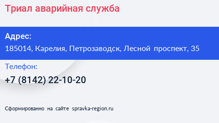 Триал, аварийная служба по адресу 185014, Карелия, Петрозаводск, Лесной проспект, 35 в дальнейшем Организация, размещена в следующих категориях: