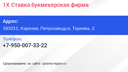 1X Ставка, букмекерская фирма по адресу 185011, Карелия, Петрозаводск, Торнева, 2 в дальнейшем Организация, размещена в следующих категориях: