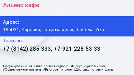 Альянс, кафе по адресу 185031, Карелия, Петрозаводск, Зайцева, 67а в дальнейшем Организация, размещена в следующих категориях: