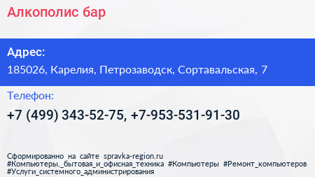 Алкополис, бар по адресу 185026, Карелия, Петрозаводск, Сортавальская, 7 в дальнейшем Организация, размещена в следующих категориях: