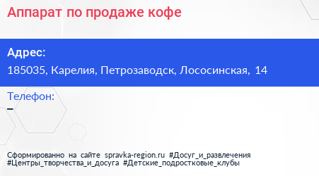 Аппарат по продаже кофе по адресу 185035, Карелия, Петрозаводск, Лососинская, 14 в дальнейшем Организация, размещена в следующих категориях:
