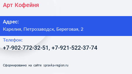 Арт Кофейня по адресу Карелия, Петрозаводск, Береговая, 2 в дальнейшем Организация, размещена в следующих категориях: