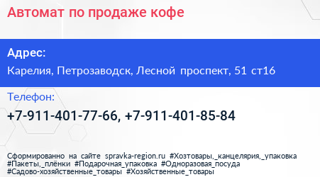 Автомат по продаже кофе по адресу Карелия, Петрозаводск, Лесной проспект, 51 ст16 в дальнейшем Организация, размещена в следующих категориях: