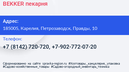 BEKKER, пекарня по адресу 185005, Карелия, Петрозаводск, Правды, 10 в дальнейшем Организация, размещена в следующих категориях: