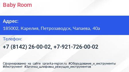 Baby Room по адресу 185002, Карелия, Петрозаводск, Чапаева, 40а в дальнейшем Организация, размещена в следующих категориях: