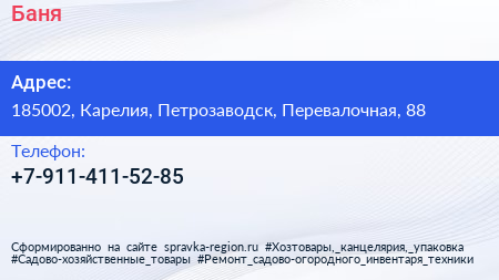 Баня по адресу 185002, Карелия, Петрозаводск, Перевалочная, 88 в дальнейшем Организация, размещена в следующих категориях: