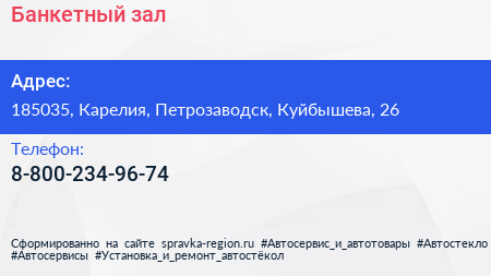 Банкетный зал по адресу 185035, Карелия, Петрозаводск, Куйбышева, 26 в дальнейшем Организация, размещена в следующих категориях:
