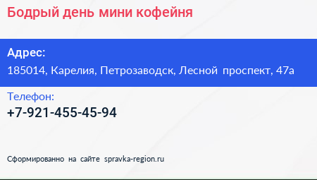 Бодрый день, мини-кофейня по адресу 185014, Карелия, Петрозаводск, Лесной проспект, 47а в дальнейшем Организация, размещена в следующих категориях: