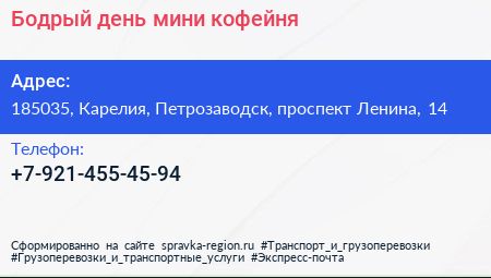 Бодрый день, мини-кофейня по адресу 185035, Карелия, Петрозаводск, проспект Ленина, 14 в дальнейшем Организация, размещена в следующих категориях: