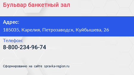 Бульвар, банкетный зал по адресу 185035, Карелия, Петрозаводск, Куйбышева, 26 в дальнейшем Организация, размещена в следующих категориях: