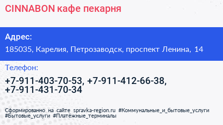 CINNABON, кафе-пекарня по адресу 185035, Карелия, Петрозаводск, проспект Ленина, 14 в дальнейшем Организация, размещена в следующих категориях: