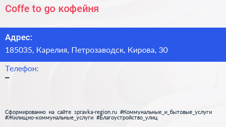 Coffe to go, кофейня по адресу 185035, Карелия, Петрозаводск, Кирова, 30 в дальнейшем Организация, размещена в следующих категориях: