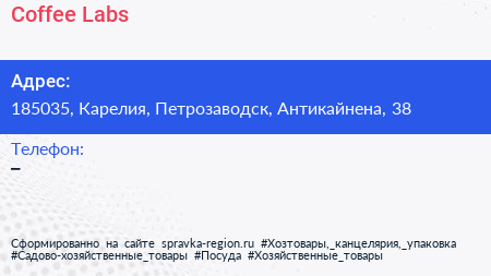Coffee Labs по адресу 185035, Карелия, Петрозаводск, Антикайнена, 38 в дальнейшем Организация, размещена в следующих категориях: