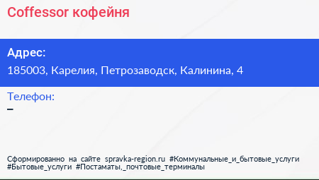 Coffessor, кофейня по адресу 185003, Карелия, Петрозаводск, Калинина, 4 в дальнейшем Организация, размещена в следующих категориях: