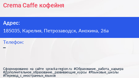 Crema Caffe, кофейня по адресу 185035, Карелия, Петрозаводск, Анохина, 26а в дальнейшем Организация, размещена в следующих категориях: