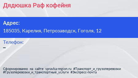Дядюшка Раф, кофейня по адресу 185035, Карелия, Петрозаводск, Гоголя, 12 в дальнейшем Организация, размещена в следующих категориях: