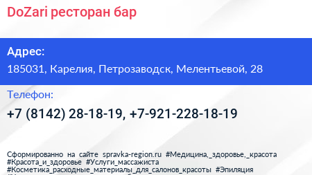 DoZari, ресторан-бар по адресу 185031, Карелия, Петрозаводск, Мелентьевой, 28 в дальнейшем Организация, размещена в следующих категориях: