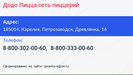Додо Пицца, сеть пиццерий по адресу 185014, Карелия, Петрозаводск, Древлянка, 16 в дальнейшем Организация, размещена в следующих категориях: