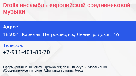 Drolls, ансамбль европейской средневековой музыки по адресу 185031, Карелия, Петрозаводск, Ленинградская, 16 в дальнейшем Организация, размещена в следующих категориях: