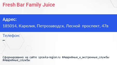Fresh Bar Family Juice по адресу 185014, Карелия, Петрозаводск, Лесной проспект, 47в в дальнейшем Организация, размещена в следующих категориях: