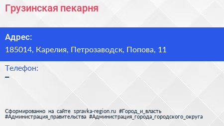 Грузинская пекарня по адресу 185014, Карелия, Петрозаводск, Попова, 11 в дальнейшем Организация, размещена в следующих категориях: