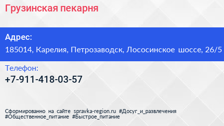 Грузинская пекарня по адресу 185014, Карелия, Петрозаводск, Лососинское шоссе, 26/5 в дальнейшем Организация, размещена в следующих категориях:
