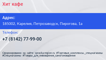 Хит, кафе по адресу 185002, Карелия, Петрозаводск, Пирогова, 1а в дальнейшем Организация, размещена в следующих категориях: