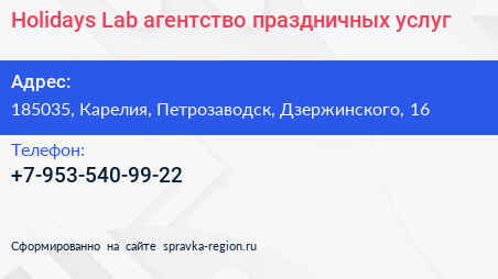 Holidays Lab, агентство праздничных услуг по адресу 185035, Карелия, Петрозаводск, Дзержинского, 16 в дальнейшем Организация, размещена в следующих категориях: