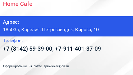 Home Cafe по адресу 185035, Карелия, Петрозаводск, Кирова, 10 в дальнейшем Организация, размещена в следующих категориях: