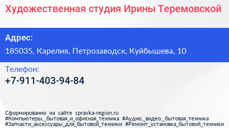 Художественная студия Ирины Теремовской по адресу 185035, Карелия, Петрозаводск, Куйбышева, 10 в дальнейшем Организация, размещена в следующих категориях: