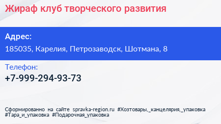 Жираф, клуб творческого развития по адресу 185035, Карелия, Петрозаводск, Шотмана, 8 в дальнейшем Организация, размещена в следующих категориях: